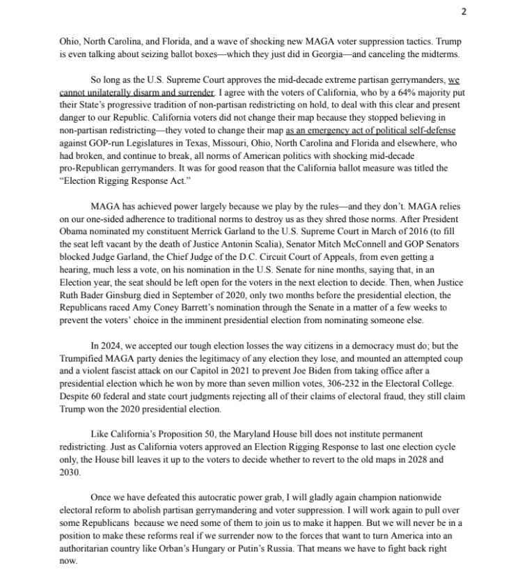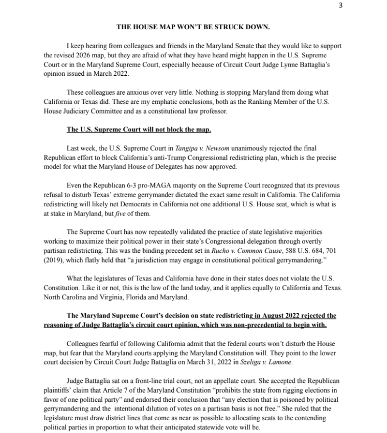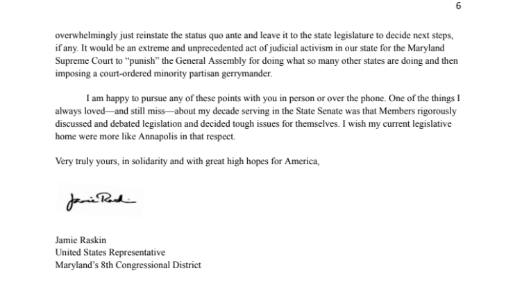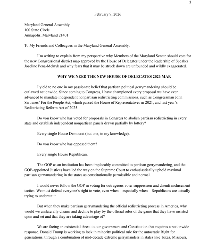 Rep. Jamie Raskin’s Letter to the Maryland General Assembly on the New Congressional Map